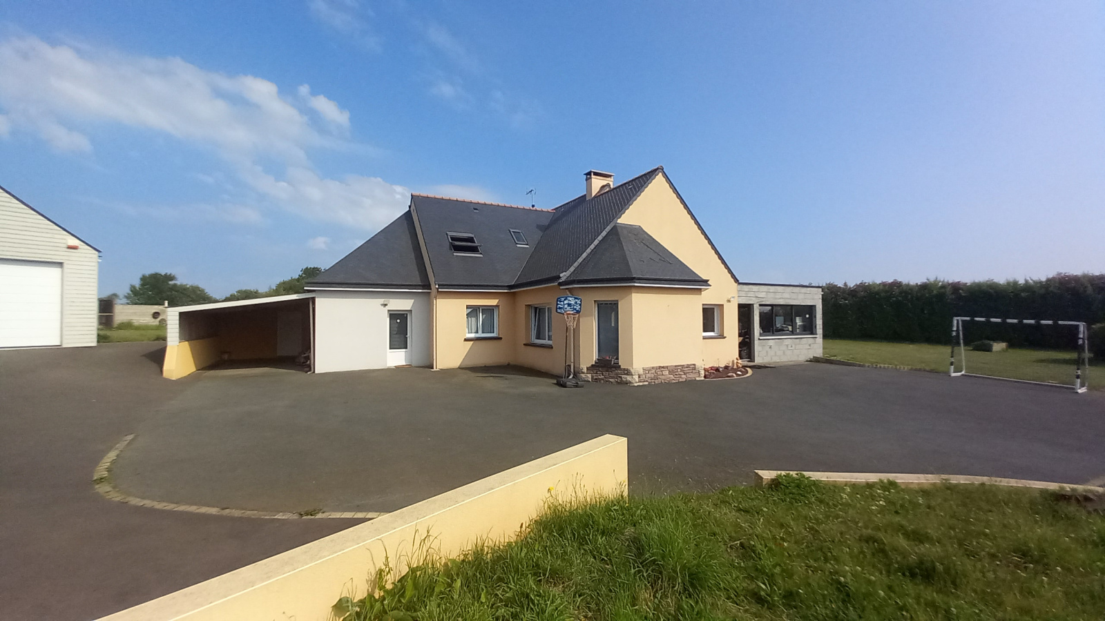 BRETAGNE - Côtes d'Armor - Située dans la charmante commune de Plouézec, à quelques pas du bourg (commerces écoles...) et à seulement 5 mn en voiture de la plage de BRÉHEC, venez découvrir cette maison contemporaine de 2009 avec son extension à terminer, réalisée en 2023, dans un environnement calme et sans vis à vis. Elle vous offre une vaste et lumineuse pièce de vie avec une cuisine aménagée et équipée donnant sur le salon/séjour et son poêle à granulés, une chambre avec placard, une pièce à aménager selon vos besoins, un bureau avec au-dessus un grenier, un cellier/buanderie, une salle d'eau à l'italienne et un W.C. A l'étage: un palier desservant 3 grandes chambres sur parquet stratifié, une salle de bain et un W.C séparé. Le tout sur une parcelle d'environ 3800 m² abritant une piscine couverte chauffée, cour goudronnée, portail électrique, un grand garage pouvant accueillir plusieurs véhicules avec point d'eau et W.C.