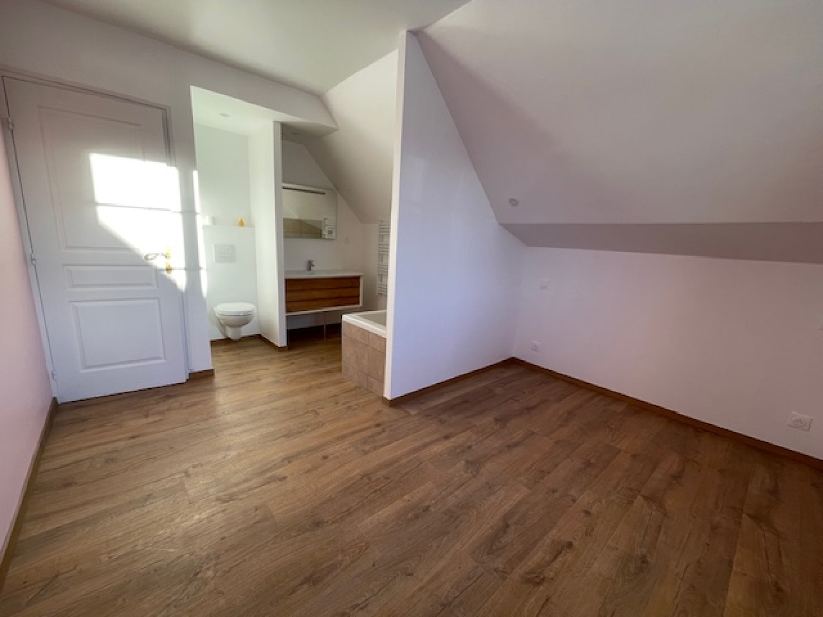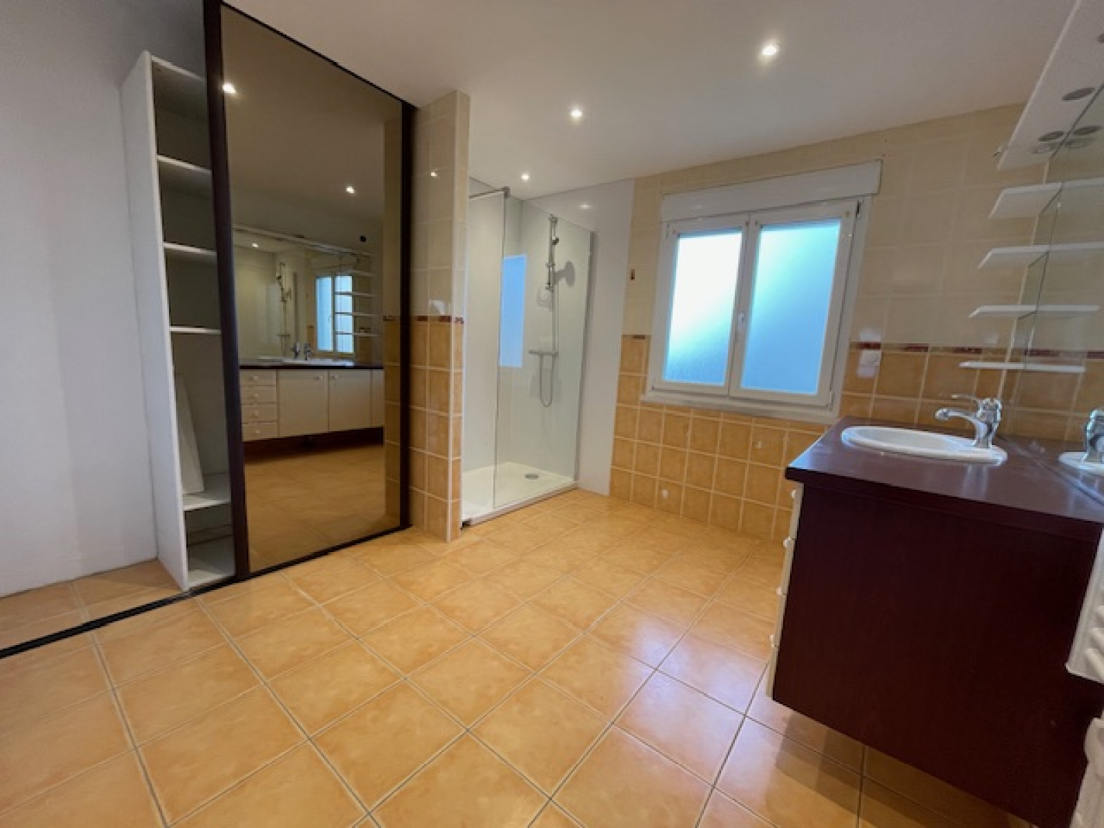 A l'étage un palier dessert une premiere chambre avec placard, une deuxième avec salle de bain et une grande chambre parentale avec salle d'eau et un coin dressing.