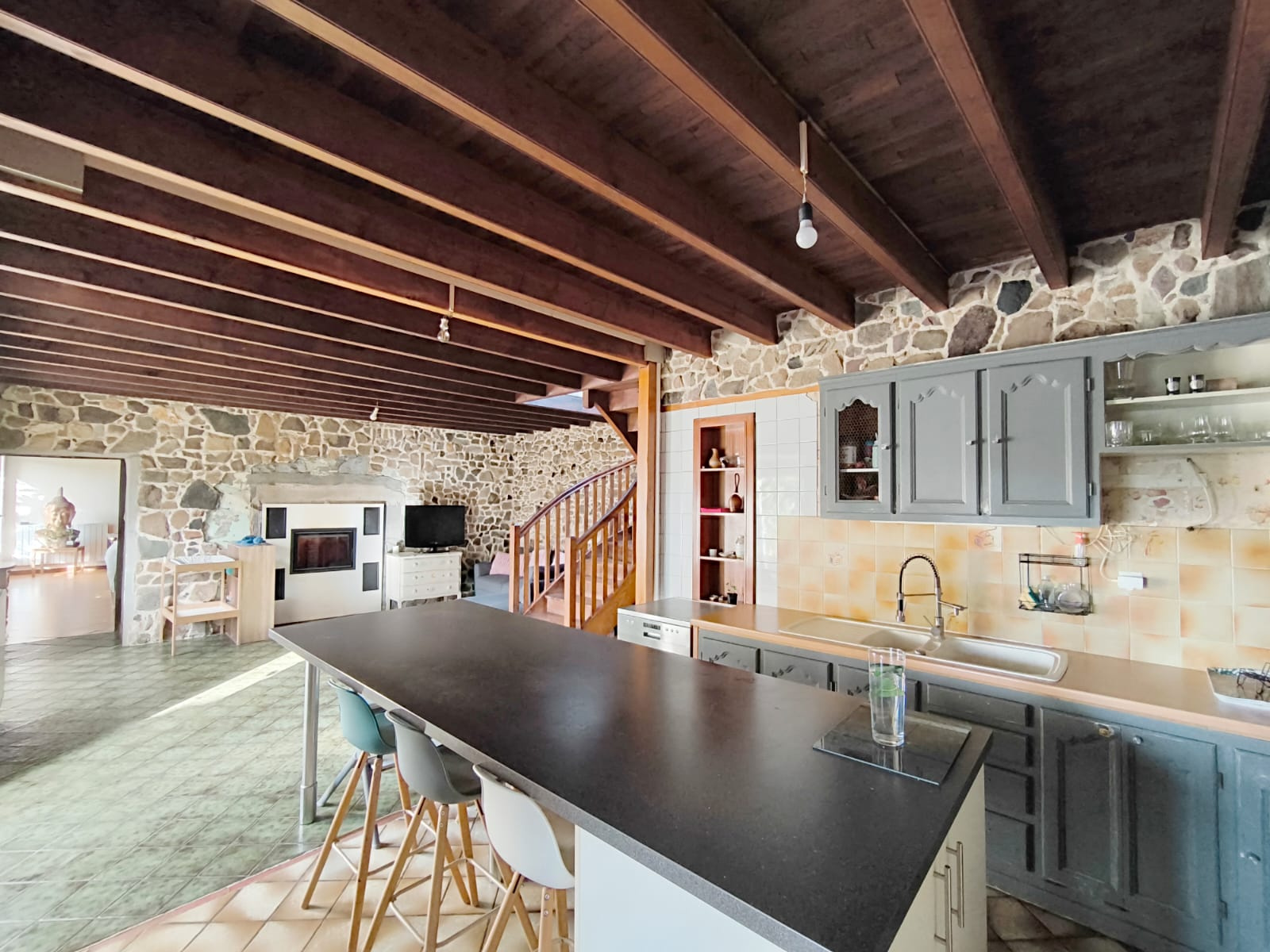La maison principale de 130m2 se compose, au rez de chaussée, d'une grande pièce de vie de 47m2 avec cuisine ouverte, d'un salon de 38m2, profitant chacun du confort d'une cheminée grâce à son double foyer, d'une buanderie et d'un WC. A l'étage, accessible de part et d'autre de la maison, vous découvrirez trois chambres, uns salle de bain, un bureau, un dressing et un WC. La maison méritera quelques travaux et le changement des menuiseries de l'étage pour révéler tout son potentiel!